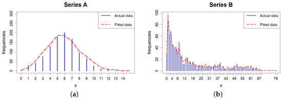 It can be easily seen that in the case of Series A, estimated parameter is ’between’ to sample mean and variance, which is expected. For Series B, the estimated values of the parameter are relatively ‘small’. This is obviously a consequence of the emphasized frequencies of smaller integer values of the observed time series (which can also be seen in the following Figure 5). Conversely, the estimated values of the parameter are close to 1. This can also be explained by the previously described properties of this time series, which has a significantly high estimated value of the first correlation.