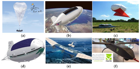 Aerial platform examples across the globe. (a) Google Loon—International, (b) HAA—USA, (c) ABSOLUTE Tethered Balloon—EU, (d) KARI—Korean, (e) Facebook fixed-wing Aircraft—International, (f) PSATRI Drone—KSA.