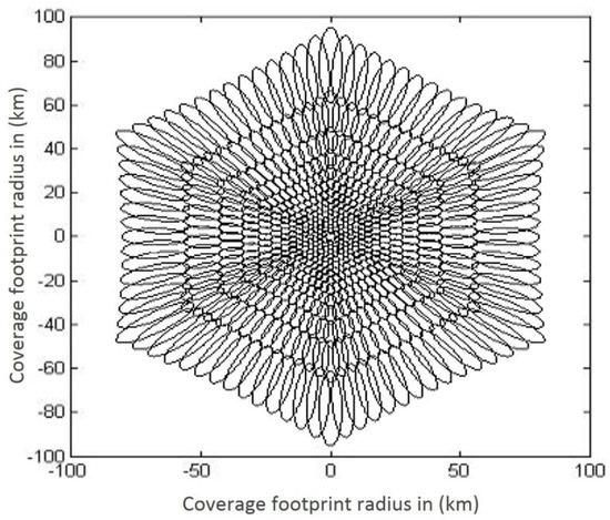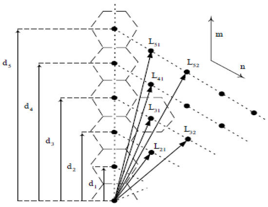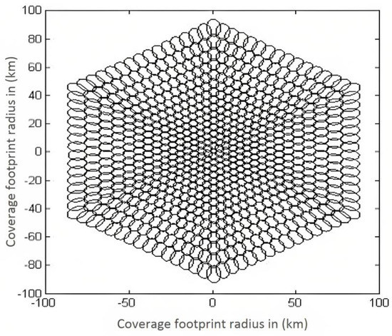 where h denotes the UAV altitude in km, x, y and z denote the cellular footprint in three dimensions, and denote beams oriented towards a cell, and c denote a major axis, while and e denote a minor axis, 3 dB beam width in the elevation plane is denoted by and the azimuth plane is denoted by . In the cellular layout geometry, and denote cell coordinates [47]. The radial distance denotes a distance from the center cell that is below an UAV to the next cell by an azimuth angle αmn that is measured from the vertical axis m, denotes the central cell radius. m and n are considered only in the first sector of the tier, whereas for other cells this is located by rotating the structure by 60° with the same central distance [48].