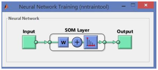 Figure 6 and Figure 7 show the simulation of the proposed AI framework using the GUI toolbox in MATLAB [49]. Figure 6 shows the SOM layout, while Figure 7 shows the NN layout. Further, such a toolbox relies on well-recognized apps that allow us to create an app interactively, transform a script into a simple app, and build an app programmatically [50]. The mathematical representation of the proposed AI framework that includes SOM and NN fitting tool techniques is shown as per Equations (12)–(19):