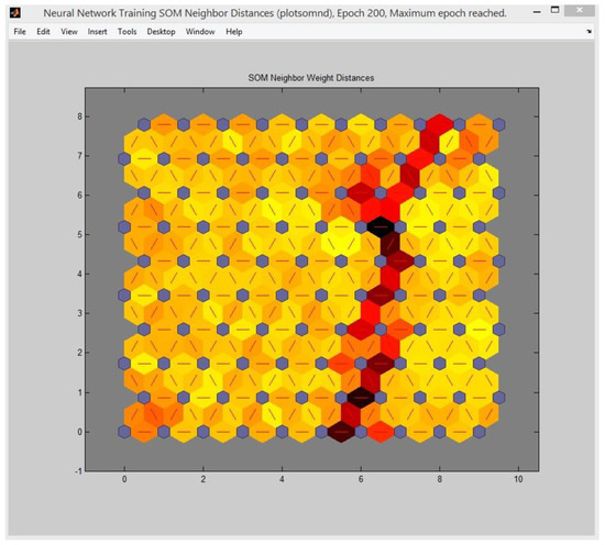 By using the GUI in MATLAB, Figure 12 shows the SOM neighbor distance plot. The gray hexagons indicate the neurons, while red lines connect adjacent neurons. The neighbor patches are colored from light to dark to represent how close each neuron’s weight vector is to the optimized cluster. Clearly, the darkest neuron in the SOM refers to a distinct cluster, which is located as it appears in the SOM sample, i.e., hit plot at number 7.