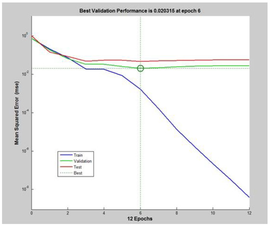 From Figure 11, Figure 12 and Figure 13, we can draw a conclusion that the optimized cluster has been well-recognized, which achieves the seven parameters that have been set to optimize the proposed model using the SOM. Figure 14 demonstrates the training, testing, and validation performance of the proposed AI framework. The obtained results show that the NN fits well for three reasons. First, the final MSE is small; second, the test set error and the validation set error have similar characteristics; third, no significant overfitting occurred in iteration 6, before which the best validation performance occurred. To note, the axes of Figure 11, Figure 12 and Figure 13 are the proportional scale of the SOM sample’s plot using the GUI toolbox in MATLAB.