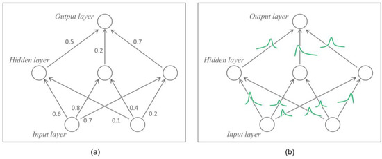 DNN is used in areas that are closely associated with human life such as autonomous driving and healthcare. However, given the potential for accidents due to overconfident DNNs of the training dataset, an alternative is now needed. BNN, which handles a weight that connects layers as random variables is one of the alternatives of DNN [45,46,47,48]. Figure 1b shows the BNN architecture. The most crucial difference between DNN and BNN is the viewpoint of weight . In contrast with DNN that uses a fixed weight, weight is assumed as a random variable of in BNN. Thus, BNN estimates a probability distribution with Bayes’ theorem. However, because the operation of posterior in Bayes’ theorem is intractable, it is difficult for BNN training to converge. To overcome this, various tractable mechanisms were proposed such as Wan et al. (2013)’s DropConnect [49] including dropout and Kingma et al. (2015)’s reparameterization trick [50,51].