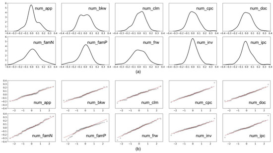 The Shapiro–Wilk test of the technology evaluation factors revealed that num_app, num_famP, and num_ipc rejected the null hypothesis at the significance level of 0.05 [56]. Thus, the distribution of the layer other than that of the above three factors can be viewed as following a normal distribution.