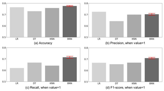 - As a result, BNN had the highest F1-score, followed by KNN, LR, and DT. This means that the performance has improved by up to 109.31% compared to the previous one. Since the range of fluctuation of BNN performance is very small, the proposed method can make stable predictions.