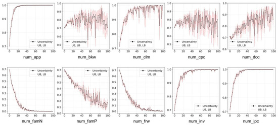 - Through the feature ablation trial, we found that the uncertainty of evaluation decreased as num_famN, num_famP, and num_frw among the factors increased. In addition, we found that num_app, num_clm, num_doc, num_inv, and num_ipc are proportional to the uncertainty of evaluation.