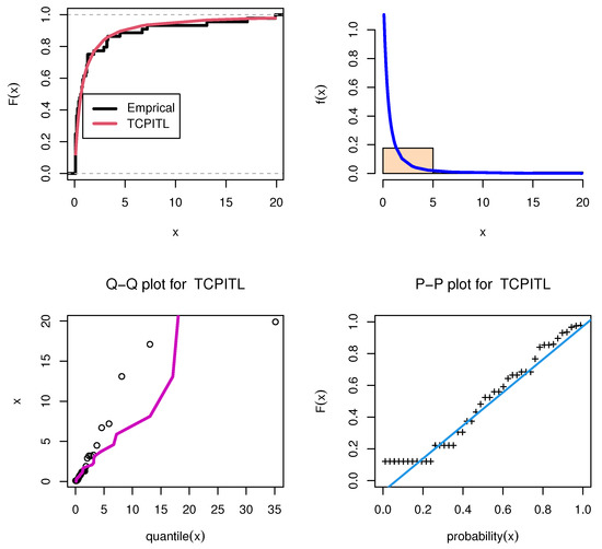 - The potential of the TCP-ITL distribution is demonstrated using four real data sets in contrast to the ITL, the Kumaraswamy (K), Marshall–Olkin–Kumaraswamy (MOK), beta, alpha power Kumaraswamy (APK), and exponentiated Kumaraswamy (EK) distributions. According to the results of the criterion measurements, the recommended distribution is the best option for the data sets under consideration.