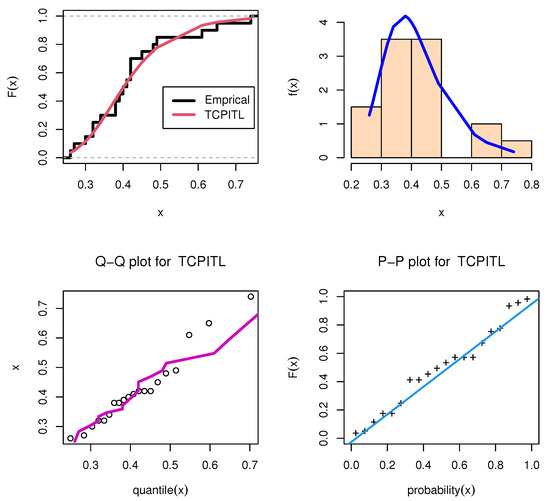 Throughout this subsection, we apply the TCP-ITL model to a real-world data set to assess its adaptability. To compare the TCP-ITL model to the other six fitted distributions, one, two, and three parameters are employed. We compare the TCP-ITL distribution with the ITL [23], beta, Kumaraswamy (K), Marshall–Olkin–Kumaraswamy (MOK) [53], alpha power Kumaraswamy (MOK) [54], and exponentiated Kumaraswamy (EK) [55].
