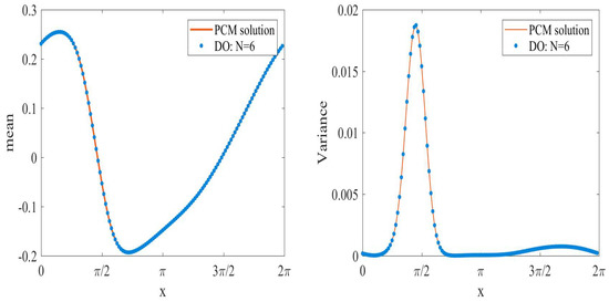 where and . After we get and , we can apply the matrix form in Equation (25). Then calculate the matrices and . Equation (31) is complicated due to the expectation that contains the third moment of the stochastic basis. A deterministic initial condition makes the stochastic coefficient be zero initially, and hence the covariance matrix for becomes singular. The hybrid PCM-DO method will be used to avoid this issue. For the numerical solution, we shall use the parameters , , , and discretization methods as shown above.
