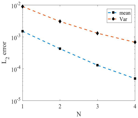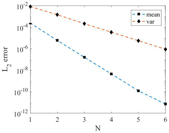 In Figure 1, the mean and variance are shown at and . They agree well with the reference solution. The error for the mean and variance for different values of modes are shown in Figure 2. We present errors in mean and variance for three values of modes: , , and . The solution at and is the best among the three cases. To this end, it can be noticed that the accuracy of the solution is affected by lower modes.