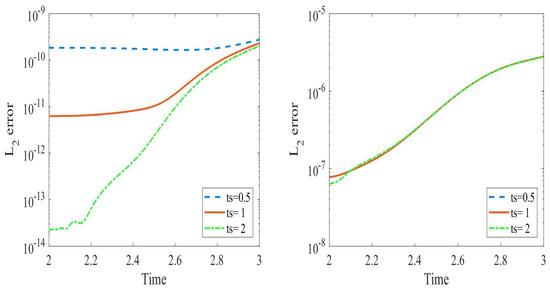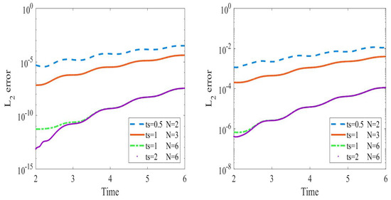 As it is shown in Figure 12, the error of the solution is computed for three switching times and with the same number of modes . We can observe that the error for the mean at is better than the errors due to other switching times. After that, the error becomes the same for the three modes. On the other hand, the error in variance is approximately the same for all switching times, so we can use as it has a smaller computational time.