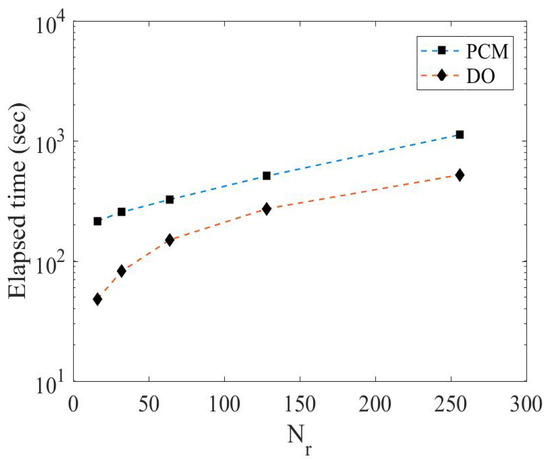 Figure 4 shows that the hybrid approach is affected by the switching time and number of modes. We observe that error for the mean and variance at and is the best among other values. For and , the solution has the same accuracy but takes more computational time. The computational time is compared when using the DO and PCM for this test case using different spatial nodes Nr. The DO is more efficient, with less computational time than the PCM, as shown in Figure 5.