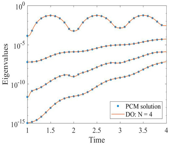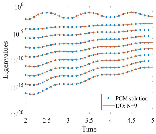 Figure 6 shows the eigenvalues variation as the solution evolves till . The computed eigenvalues are compared with the reference solution. A good agreement is noticed as shown in the figure. It is observed that the lower eigenvalues from the mode have an order: , respectively, making the covariance matrix extremely ill-conditioned; it becomes singular and hence sensitive to any perturbations.