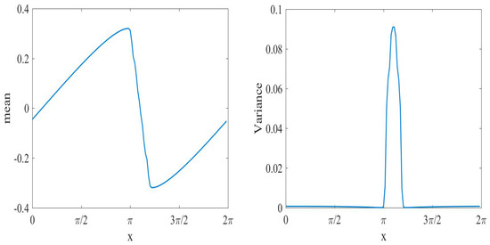 The mean solution (left) and its variance (right) for the inviscid Burgers’ equation switching at with modes number .