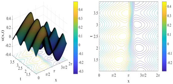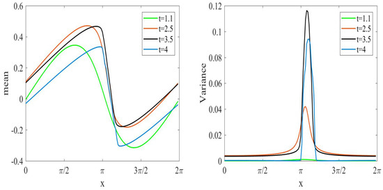 This model is the same model given in (32), but with different initial condition that allows for shock formation. We consider the solution up to a final time . The above described DO method in Section 2 is applied to the model Equation (37). The convective term should be handled using any suitable technique such as first and/or second-order upwind scheme. This will prevent oscillatory behavior of the solution, especially near the shock wave. Figure 14 shows the solution mean and variance at the occurrence of the shock wave. The solution is illustrated at switching time , and the number of modes considered is . As the waveform steepens, the edges form causing a shock wave. We can notice how variance become relatively large close to the shock wave. The maximum value of variance occurs exactly at the shock wave. The mean field of the solution is shown in Figure 15. We present the mean field and the contour lines’ evolution up to the breaking time. The sinusoidal wave shape sharpens as the time evolves till the shock wave occurs. The mean and variance for the solution is sketched at different values of time as shown in Figure 16. Time values and are considered in Figure 16. It can be observed that the sinusoidal wave shape is distorted. The distortion of the wave profile starts from the initial data, and the dispersion of the wave profile evolves with the time increase.