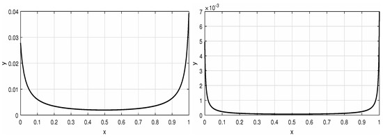 Solution of BVP (9) with and (left) and (right). These functions reach their local minimum at a point asymptotically approaching .
