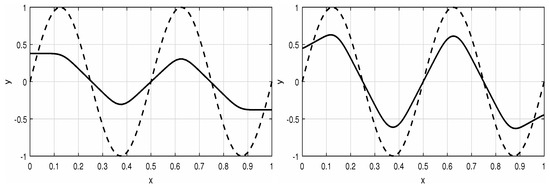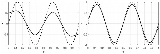 Solution of the semilinear Neumann problem (12) for and (left) and (right). The dashed line shows the function , the solution of the reduced problem.