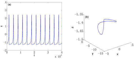 Hidden period-4 attractor of System (8) when : (a) time evolution of variable ; (b) phase portrait in 3D space.