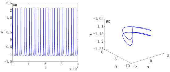 Hidden period-2 attractor of system (8) when : (a) time evolution of variable ; (b) phase portrait in 3D space.