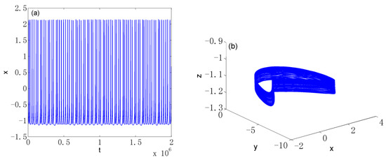 Hidden period-1 attractor of System (8) when : (a) time evolution of variable ; (b) phase portrait in 3D space.