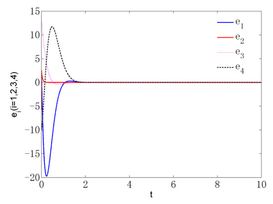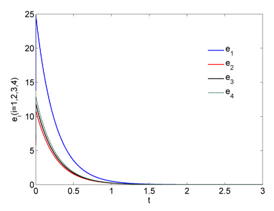 Figure 11 depicts the time series of error System (18) with controllers (20) and Figure 12 presents the synchronization status of variables in Theorem 3.