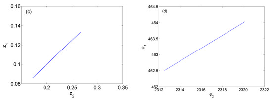 Furthermore, we select , , , , , , , , ; with different values of , dynamics of System (8) are computed for and , which are drawn in Figure 5 (hidden periodic-1 attractor) and Figure 6 (hidden multi-periodic attractor), respectively. As shown in Figure 5 and Figure 6, different hidden attractors can also be induced by the alteration of parameter .