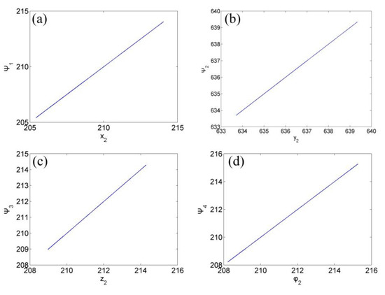 Synchronization status of variables with projection factors , , , in Theorem 1. (a) Synchronization state between variables and with ; (b) Synchronization state between variables and with ; (c) Synchronization state between variables and with ; (d) Synchronization state between variables and with .