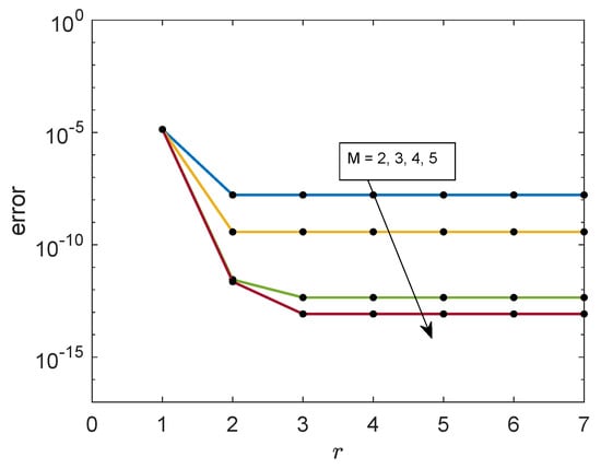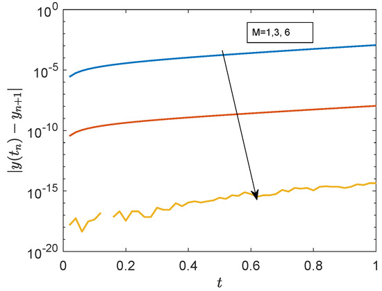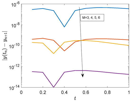In this case, we have and As can be clearly observed in Figure 1, the accuracy of the method greatly increases as M increases. Figure 2 shows that there is an excellent agreement between the exact and the approximate solutions. This can be seen also on the errors of order in Figure 1.