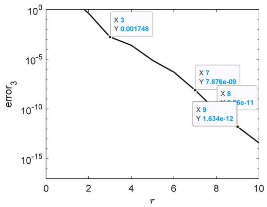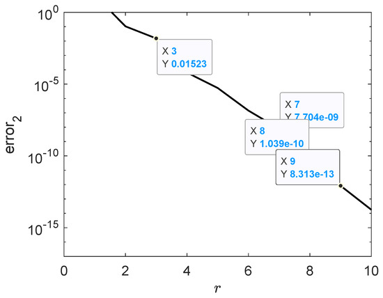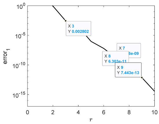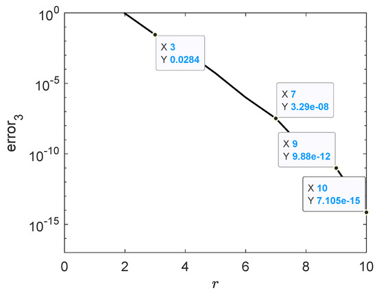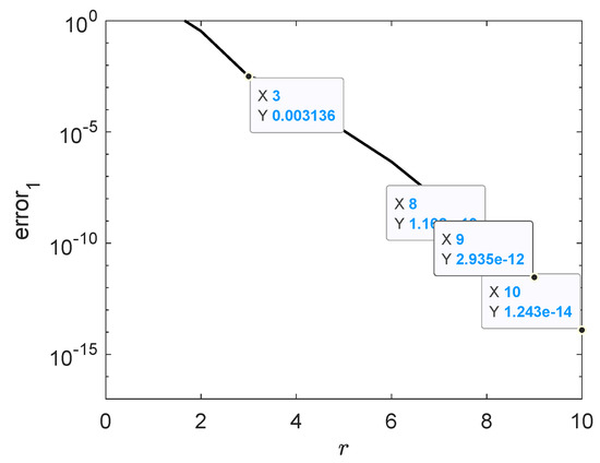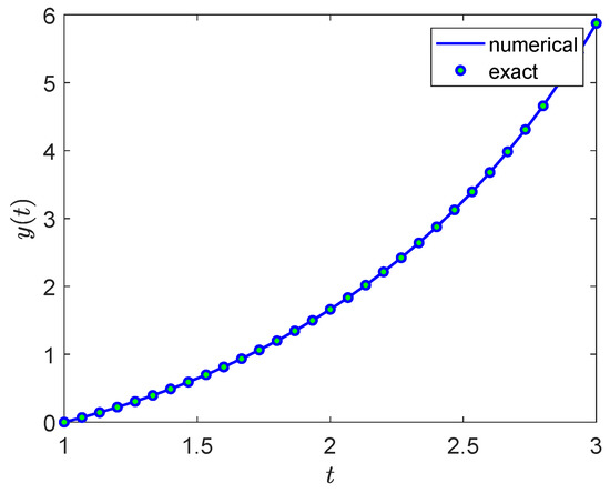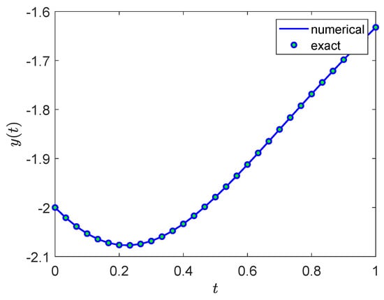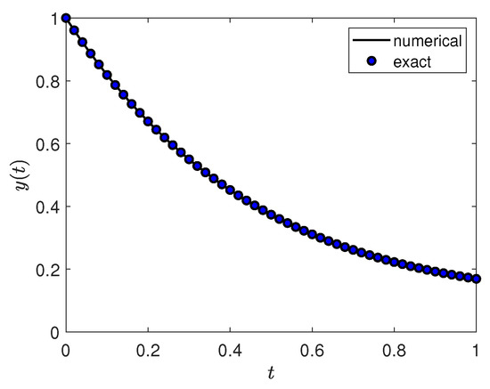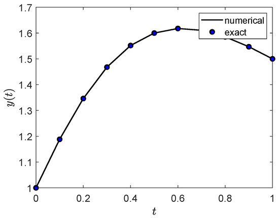 In this example, and The exact and approximate solutions are depicted in Figure 5. We observe that there is an excellent agreement between the two sets of solutions. This can also be perceived in Figure 6 which depicts a very high level of accuracy.