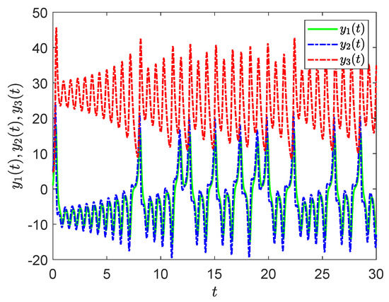 This dissipative structure/system is characterized by the spontaneous appearance of symmetry breaking (anisotropy) and the formation of complex and chaotic structure Brogliato et al. [22]. In these structures, interacting particles exhibit long range correlations. The current system (49), is similar to a thermodynamically open system that is operating out of the thermodynamic equilibrium in an area with which it exchanges energy and matter. Figure 33, Figure 34, Figure 35, Figure 36 and Figure 37 display the chaotic behaviors of these dissipative chaotic systems.