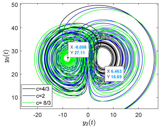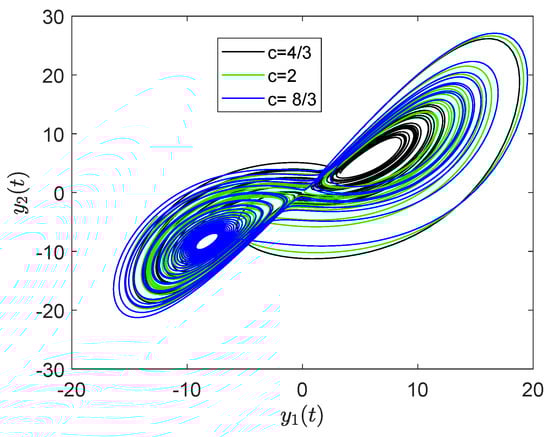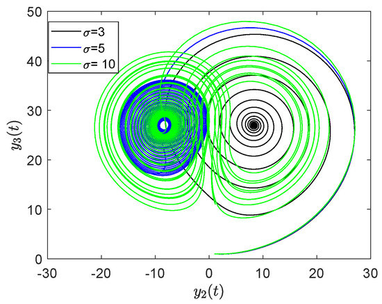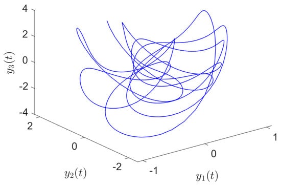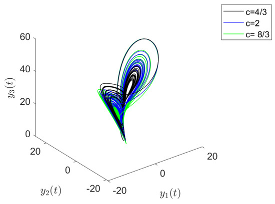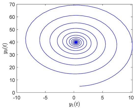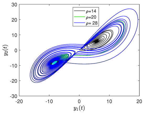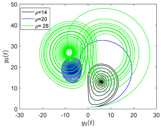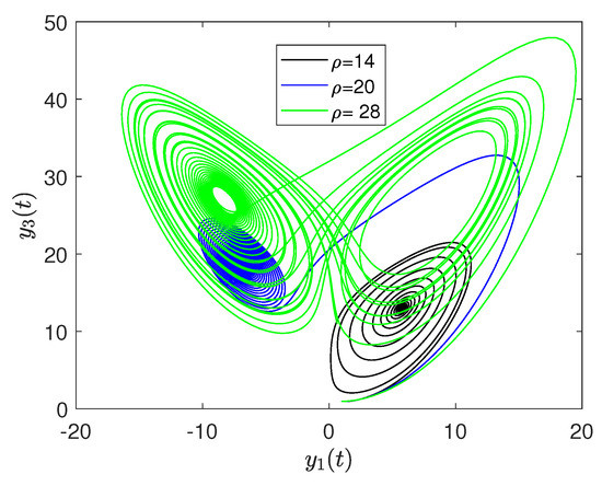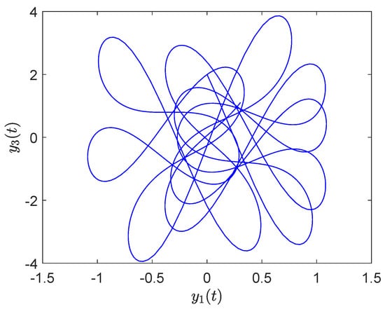 where are the physical parameters. This system has an additional nonlinear term compared to the Lorenz system. This extra nonlinear term leads to essential differences in the analytical structure and dynamics of the system. This system describes the following physical processes: convective fluid motion in a ellipsoidal rotating cavity, a rigid body rotation in a resisting medium, the forced motion of a gyrostat, and a convective motion in harmonically oscillating horizontal fluid. Selected phase portraits are depicted in Figure 29, Figure 30, Figure 31 and Figure 32. Figure 29 shows that very chaotic patterns are initially exhibited and thereafter the flows exhibit somehow steady states as .