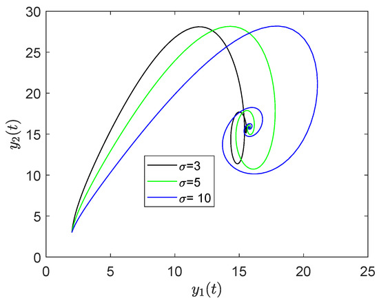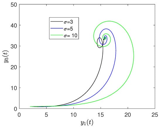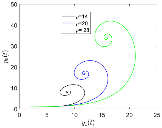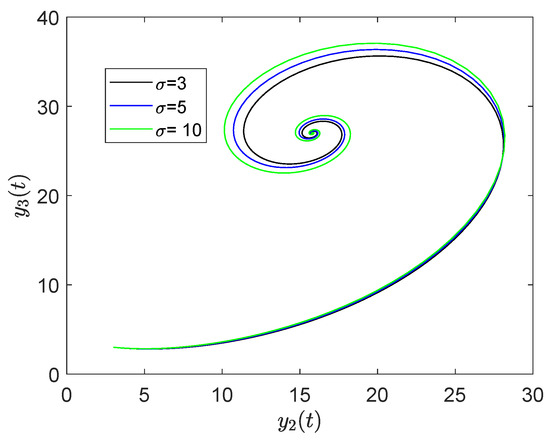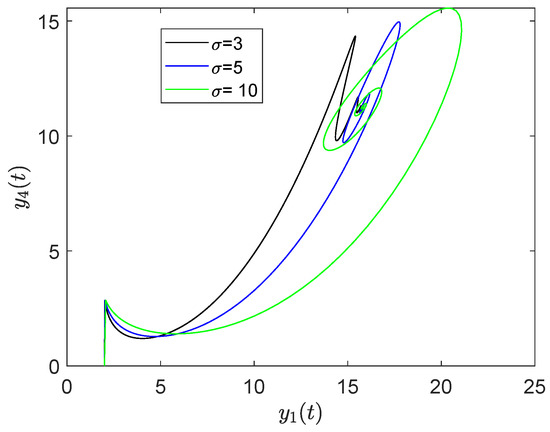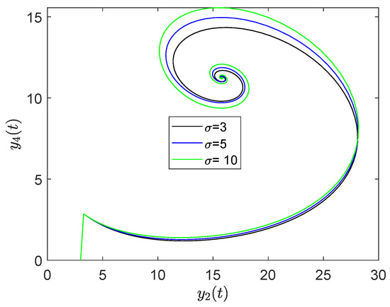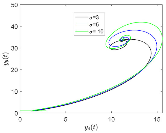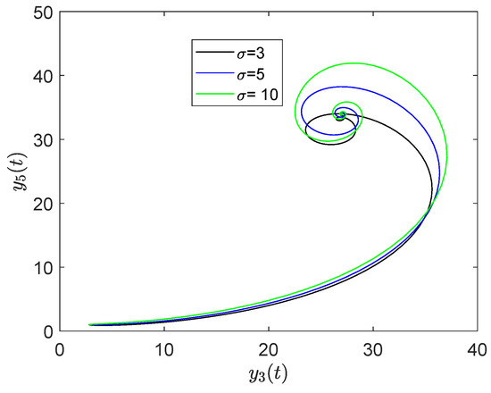 In Figure 26, Figure 27 and Figure 28, we display the phase portraits of and when varying the three parameters.