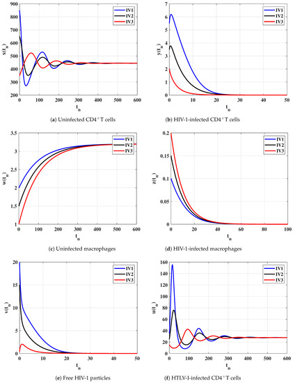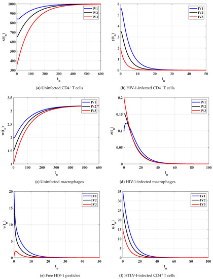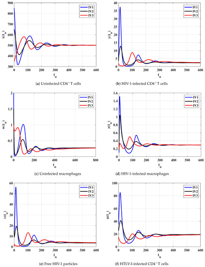 Case (IV) and , and thus, and . Figure 4 illustrates that the solutions of the discrete-time model starting with initial values IV1-IV3 converge to the equilibrium . Based on Lemma 2 and Theorem 4, exists and it is GAS. This result shows that the HTLV-I and HIV-1 co-infection can be reached for all initial states.