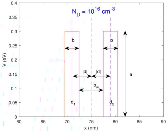 A standard Resonant Tunneling Diode structure [21] has been implemented, as shown in Figure 1. The barriers have depth 3 nm, height 0.3, and the quantum well dimension is = 5 nm, symmetric with respect to the mid-point (total length ). The barrier structure is embedded in a 30 nm lightly doped region () which is connected to 60 nm highly doped regions on either side ().