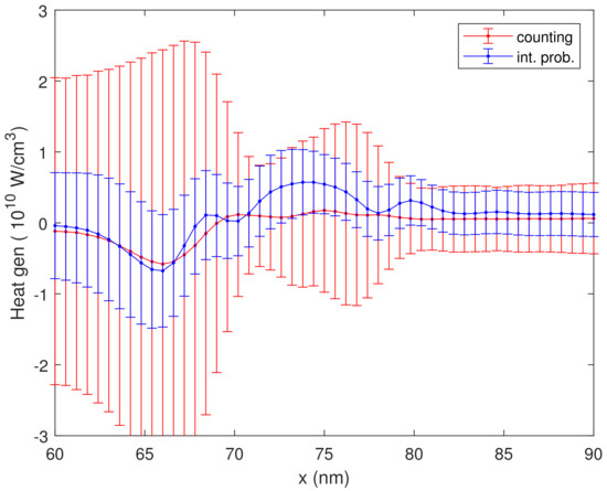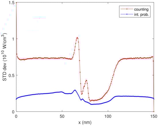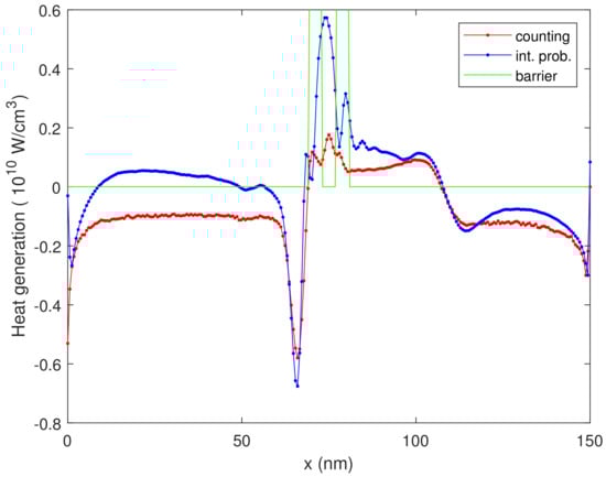 In order to have a significant lattice temperature increase with respect to the equilibrium temperature of 300 K, the applied bias voltage must be greater than V. In Figure 2, we plot the heat generation rate versus the position, evaluated by means of the counting estimator (30) and the integrated probability estimator (32), for V. From this figure, we can see that the maximum heat is produced inside the quantum well region, representing a so-called hot spot region.