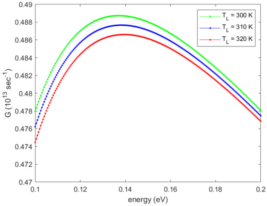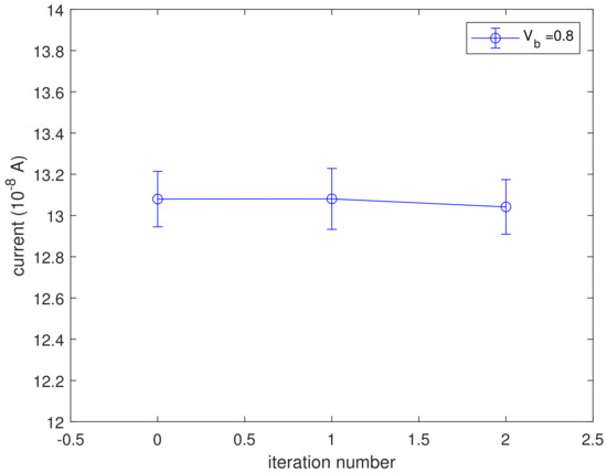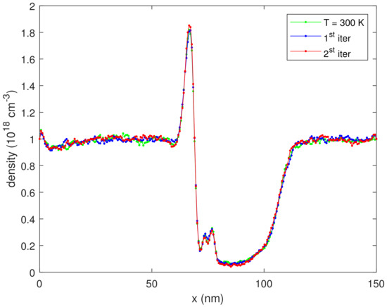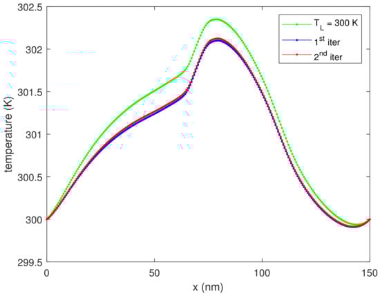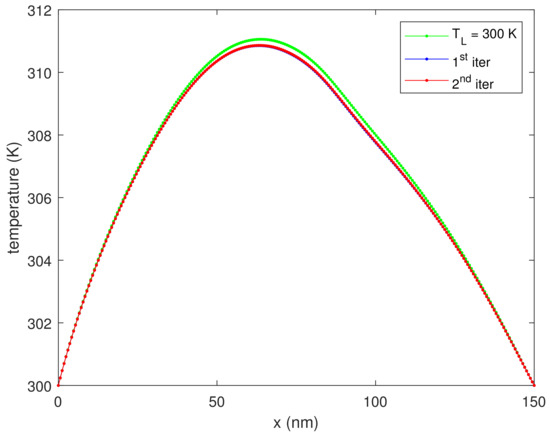 Figure 6 shows the lattice temperature evaluated by means of the heat diffusion Equation (28) for the first two iterations, which are enough to reach the convergence. We observe that the lattice temperature is decreasing with the iteration number. To explain this behavior, one must consider the function in Equation (31). This function represents the difference between the emitted and absorbed phonon probability; if this quantity is positive, more phonons are released into the lattice and in turn the temperature increases. We plot this quantity in Figure 7 showing that, for this particular kind of scattering mechanism, it decreases with the lattice temperature. In Figure 8, we plot the current versus the iteration number, proving that this quantity is constant. If we double the applied voltage to V, the increase of temperature is of a factor 5 as shown in Figure 9.