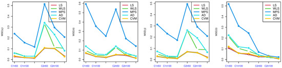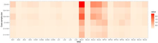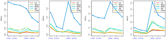 Table 2, Table 3, Table 4 and Table 5: discuss the bias and MSE for six estimation methods as MLE, LS, WLS, MPS, CVM, and AD, with a different sample size. Figure 3, Figure 4, Figure 5 and Figure 6 discuss the MSE of the parameters for each estimation method, which shows the general downward trend with sample size increases and used to compare the estimation method. Figure 7, Figure 8, Figure 9 and Figure 10 obtained the heat-map of MSE for parameters based on each estimation method, where the X-label contains an MSE such as: Table 2, Table 3, Table 4 and Table 5 discuss the bias and MSE for six estimation methods including MLE, LS, WLS, MPS, CVM, and AD, with different sample sizes. Figure 3, Figure 4, Figure 5 and Figure 6 discuss the MSE of parameters for each estimation method, which shows a general downward trend with an increasing sample size and is used to compare the estimation method. Figure 7, Figure 8, Figure 9 and Figure 10 obtained the heat-map of MSE for the parameters based on each estimation method, where the X-label contains the MSE as: Table 2, Table 3, Table 4 and Table 5 discuss the bias and MSE for six estimation methods, namely MLE, LS, WLS, MPS, CVM, and AD, with different sample size. Figure 3, Figure 4, Figure 5 and Figure 6 discuss the MSE of parameters for each estimation method, which showed a general downward trend with an increasing sample size and used to compare the estimation method. Figure 7, Figure 8, Figure 9 and Figure 10 obtained the heat-map of MSE for parameters based on each estimation method, where the X-label contains an MSE such as: MLE1: MSE() based on MLE, MLE2: MSE() based on MLE, MLE3: MSE() based on MLE, MLE4: MSE() based on MLE, LS1: MSE() based on LS, LS2: MSE() based on LS, LS3: MSE() based on LS, LS4: MSE() based on LS, WLS1: MSE() based on WLS, WLS2: MSE() based on WLS, WLS3: MSE() based on WLS, WLS4: MSE() based on WLS, MPS1: MSE() based on MPS, MPS2: MSE() based on MPS, MPS3: MSE() based on MPS, MPS4: MSE() based on MPS, AD1: MSE() based on AD, AD2: MSE() based on AD, AD3: MSE() based on AD, AD4: MSE() based on AD, CVM1: MSE() based on CVM, CVM2: MSE() based on CVM, CVM3: MSE() based on CVM, and CVM4: MSE() based on CVM. However, the Y-label contains a sample case and size as C1n50 is MSE when n = 50 in the first sub-Table result (for example, in Table 2, = 0.7), C2n50 is MSE when n = 50 in the second sub-Table result (for example, in Table 2, = 1.8), C2n100 is MSE when n = 100 in the second sub-Table result, C2n150 is MSE when n = 150 in the second sub-Table result, C1n100 is MSE when n = 100 in first sub-Table result, C1n150 is MSE when n = 150 in first sub-Table result. We look for rectangles that have the darkest colors to determine which sets of categories have the highest values of MSE and which sets have the lowest MSE which have the right colors.