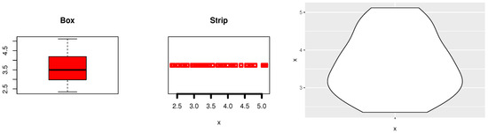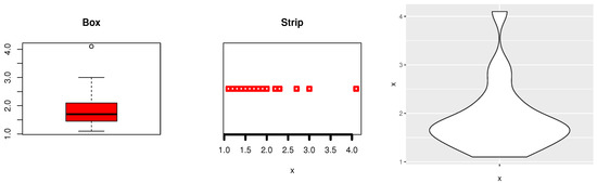 Data-I: Barco et al. [33] used this dataset as “1.1, 1.4, 1.3, 1.7, 1.9, 1.8, 1.6, 2.2, 1.7, 2.7, 4.1, 1.8, 1.5, 1.2, 1.4, 3.0, 1.7, 2.3, 1.6, 2.0”, which the information displays how quickly 20 people felt better after taking an analgesic. Figure 14 discusses the description of Medical data-I using the box plot, strip plot, and Violine plot of the data to check that Medical data-I does not have outlier problems and whether the data have symmetric ships. Medical data-I was reported to be asymmetrical, and certain outlier observations were confirmed.