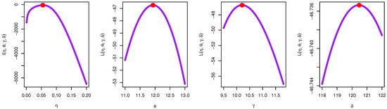 By taking the first derivative of the function with respect to , , , and , and solving the resulting nonlinear equations, at = 0, = 0, = 0, and = 0, where , we obtain the value of the parameter estimates.