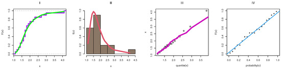 The TIIEHL-PLo distribution is used in this section to model several real data examples from many scientific domains. Different distributions, including the extended odd Weibull inverse Nadarajah–Haghighi (EOWINH) [26], Kumaraswamy Weibull (KW) [27], MOAPLo, Marshall–Olkin alpha power extended Weibull (MOAPEW) [28], ELo, IWLoPS, WLo, and GLo models, are offered for comparison with the TIIEHL-PLo model.