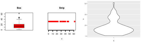 Data-II: The most recent data, cited by [34], which shows the number of daily confirmed death cases linked to COVID-19. The dataset is given as follows: “1.00, 1.00, 2.00, 4.00, 5.00, 1.00, 1.00, 3.00, 6.00, 6.00, 4.00, 1.00, 5.00, 6.00, 6.00, 8.00, 5.00, 7.00, 7.00, 9.00, 9.00, 15.00, 17.00, 11.00, 13.00, 5.00, 14.00, 5.00, 13.00, 9.00, 19.00, 15.00, 11.00, 14.00, 12.00, 11.00, 7.00, 13.00, 10.00, 20.00, 22.00, 21.00, 12.00, 14.00, 9.00, 14.00, 7.00, 16.00, 17.00, 13.00, 21.00, 11.00, 11.00, 8.00, 11.00, 12.00, 15.00, 21.00, 20.00, 18.00, 15.00, 14.00, 21.00, 16.00, 11.00, 28.00, 29.00, 19.00, 14.00, 19.00, 29.00, 34.00, 34.00, 46.00, 46.00, 47.00, 36.00, 38.00, 40.00, 32.00, 39.00, 34.00, 35.00, 36.00, 35.00, 45, 62” The data consists of 89 observed values. Figure 17 describes Medical data-II using box plot, strip plot, and Violine plot of the data to verify whether Medical data-II has any outlier problems and whether the data have symmetric ships. Medical data-II was reported to be asymmetrical, and certain outlier observations were confirmed.