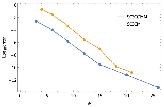 Table 7 displays the maximum errors that resulted from the application of our four methods SC3COMM, SC3GOMM, SC3CM and SC3TM. Again, Figure 3 presents Log-error for various N to show the stability of solutions of Example 5 if the presented four methods are applied.