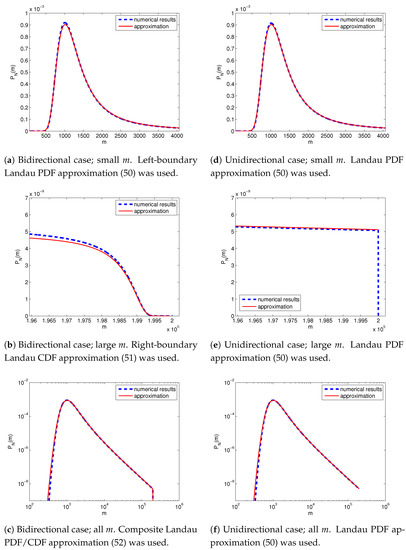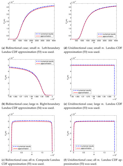 In the unidirectional case (), the Landau CDF approximation (50) applied uniformly to all resistant subpopulation sizes (Figure 4d–f). Again, a sharp cut-off was observed at in the unidirectional case (Figure 4e), whereas a Landau CDF in the right boundary layer appeared in the reversible case (Figure 4b).