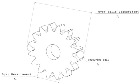 There are direct and indirect methods for measuring tooth thickness, including chordal thickness measurement (), span measurement (), and over-ball measurement (). Among these methods, span and over-ball measurements are more industrially applicable because of their higher measurement precision and the comparatively lower equipment involved in the measurement process [25]. A schematic view of span and ball measurements is illustrated in Figure 1.