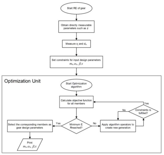 With a valid reference for the design, the designer must extract the exact geometry of the redesigned gear. For the completion of the RE of a cylindrical helical gear, it is obligatory to determine the number of teeth , normal module , normal pressure angle , addendum modification , and helix angle . According to Equations (2)–(7), identifying the primary gear input parameters based on measurements obtained from and is impossible to solve these equations. This arises from the complex calculations governing the relations between gear input parameters and measured output characteristics. So, there is a great need to use novel methods in the RE of gears to obtain influential input parameters. Because of the inability of existing computational and mathematical methods to analytically solve these equations, it seems that applying modern evolutionary optimization algorithms can be a good choice to obtain gear design parameters in the RE process.