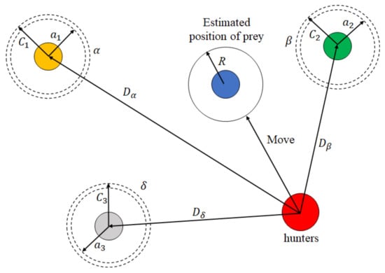 In the next step, the hunting process starts with wolves as the leaders and wolves as the hunting contributors. Mathematically simulated hunting assumes that , , and individuals have better information about the location of prey. Therefore, all individuals update their positions according to the below equations: