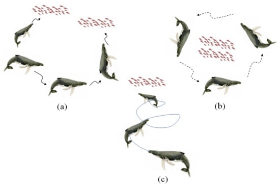Whale Optimization Algorithm: Introduced by Mirjalili et al., WOA is a swarm optimization method inspired by the hunting behavior of humpback whales. The hunting process involves searching, encircling the prey, and finally attacking to catch it [35]. The relatively easy implementation of the algorithm and its configuration with fewer parameters are the advantages of this optimization technique. The prey is the answer to the optimization problem that must be determined during the WOA process [36]. The hunting of humpback whales is illustrated in Figure 5. The movement of randomly created whales toward the prey or leader whale is shown in Figure 5a. The encircling process of the prey by the whales and their spiral movement while emitting bubbles to surround the prey is illustrated in Figure 5b,c, respectively [37].
