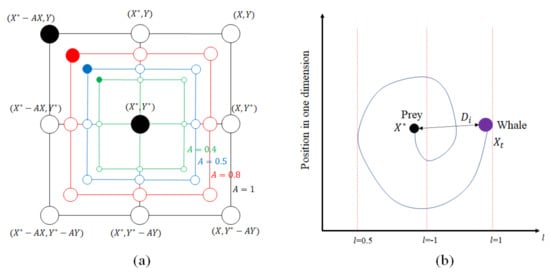 It must be added that if , determines the member with the best fitness value. Therefore, will update the position of members automatically to encircle the prey. In the final step, the whales catch their prey, start to move in a spiral route, and simultaneously narrow the siege [38]. This process is illustrated in Figure 6.