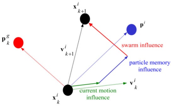 in which and are a new position and previous position of particle i. The updating process of particles’ positions is illustrated in Figure 7.