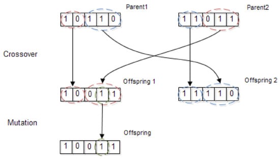 GA deals with a set of members or solutions in the total generated population. The solutions are ranked in the population based on their fitness values. The solutions placed at the top have more chance to participate in the reproduction of the next generations, and other solutions with lower fitness must be removed from the population, and new solutions can be generated. This happens by applying crossover and mutation operators to individuals. A sample of operators applied to a pair of parents to generate new offspring is illustrated in Figure 8.